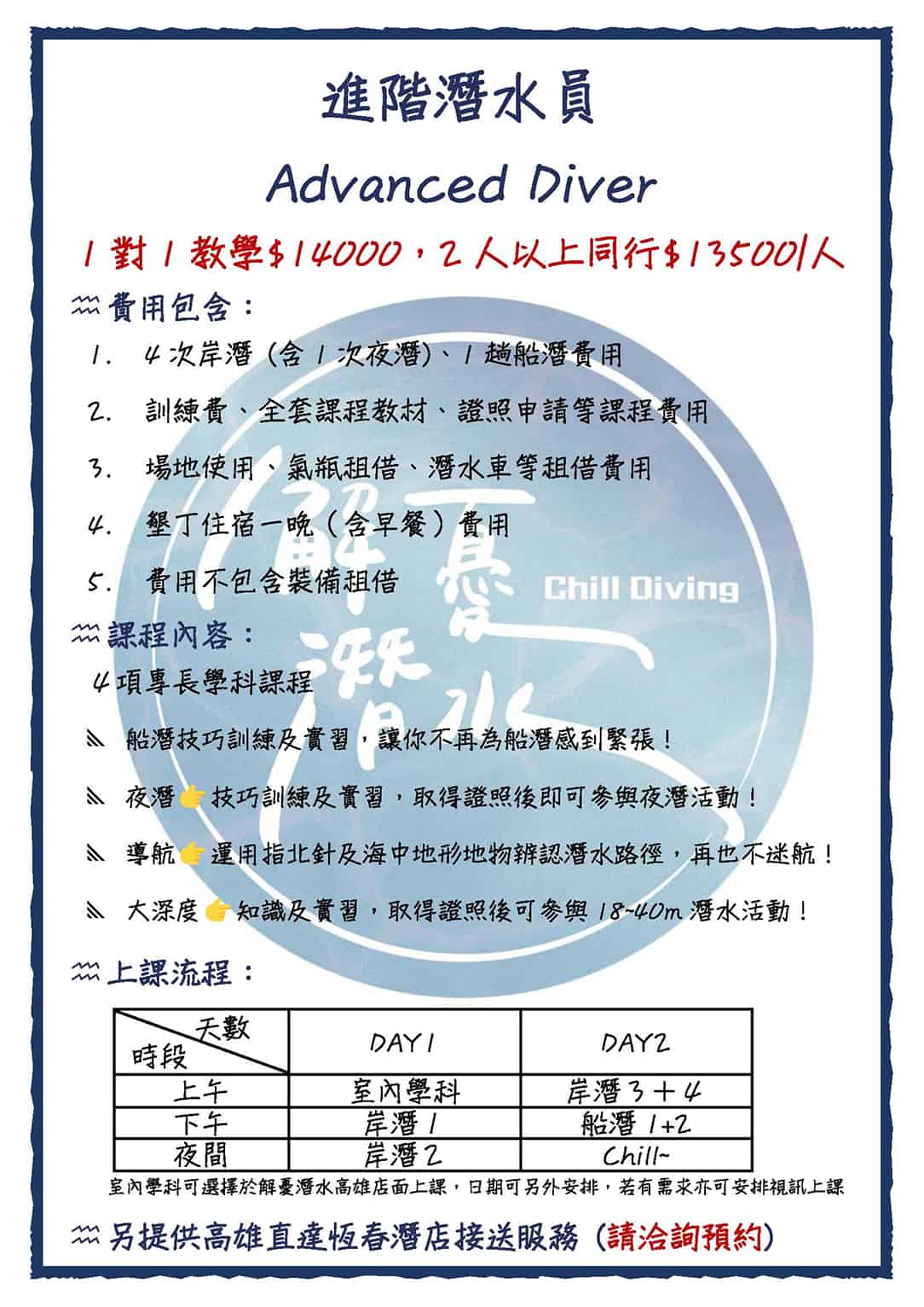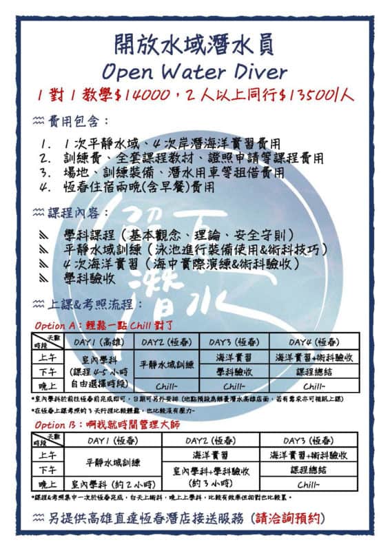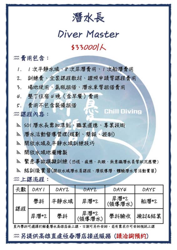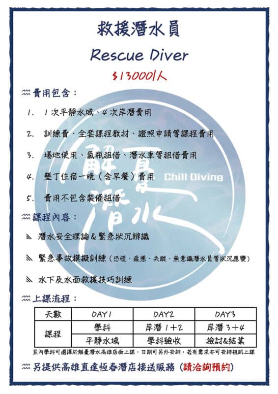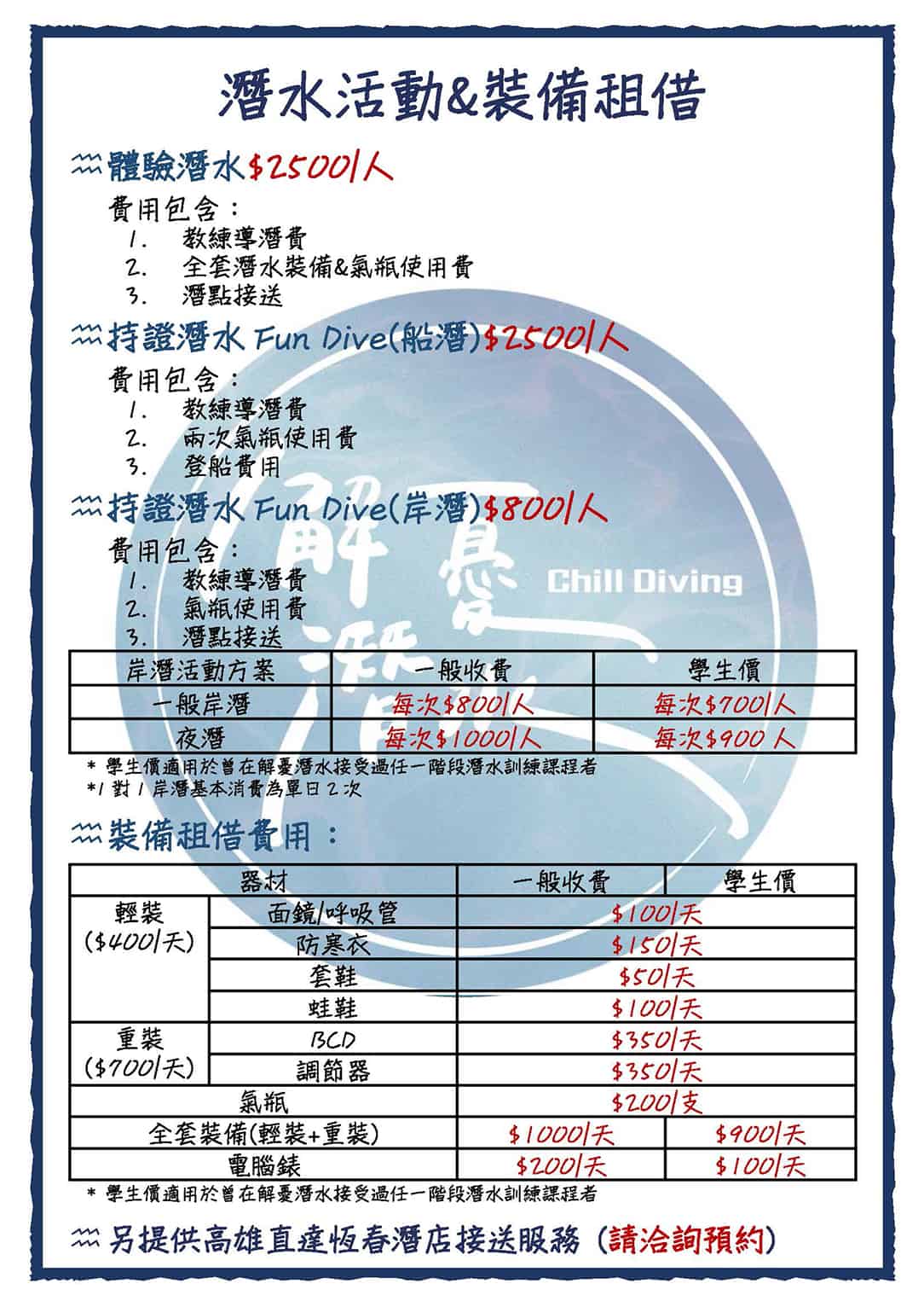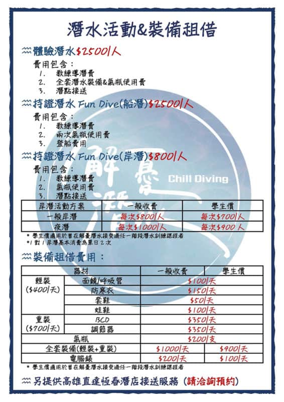 加入LINE聯絡 高雄 恆春 墾丁 潛水|潛水旅遊|水肺潛水| 自由潛水|潛水課程|潛水考照 推薦 立即來電預約 加入LINE聯絡 高雄 潛水|潛水旅遊|水肺潛水|自由潛水|潛水課程|潛水考照 推薦 立即來電預約 加入LINE聯絡 高雄 潛水|潛水旅遊|水肺潛水|自由潛水|潛水課程|潛水考照 推薦 立即來電預約 潛水課程&旅遊 專屬潛水車 學科教室 背包客棧 裝備販售店面 WORK HARD CHILL HARDER 關於我們 解憂潛水Chill Diving 「解憂」”chill”是休閒潛水能夠帶給我們最棒的感受,來海邊潛水chill一下吧!和我們一起解除生活中的一切憂愁! 教練Hao:我喜歡與海洋生物互動、喜歡置身於海底忘卻一切煩惱的感覺,所以我熱愛潛水,更熱衷於將這項最棒的技能傳授給所有喜歡大海的人。 關注我們 FacebookInstagram 主打特色 教練溫和有耐心,不必擔心上課時表現不好而被罵。 配合學生狀況調整教學步調。 不定期主辦各地區的潛水旅遊團,往後潛水不必再四處詢問! 經營理念 水肺潛水在學會基本的技巧和安全原則以後,會是個讓人放鬆又有趣的休閒活動。 給學生最chill最無壓力的學習過程,不必擔心自己在課程中表現不佳而產生壓力。 幫助所有喜歡大海的人,能夠透過良好、輕鬆的學習過程,逐步使潛水成為一個可以長期經營的個人興趣! 主打特色 教練溫和有耐心,不必擔心上課時表現不好而被罵。 配合學生狀況調整教學步調。 不定期主辦各地區的潛水旅遊團,往後潛水不必再四處詢問! 經營理念 水肺潛水在學會基本的技巧和安全原則以後,會是個讓人放鬆又有趣的休閒活動。 給學生最chill最無壓力的學習過程,不必擔心自己在課程中表現不佳而產生壓力。 幫助所有喜歡大海的人,能夠透過良好、輕鬆的學習過程,逐步使潛水成為一個可以長期經營的個人興趣! WORK HARD CHILL HARDER 服務項目 提供SDI國際水肺潛水訓練課程、Fun Diving 持證潛水、體驗潛水、專業潛水品牌裝備販售等服務。不論是對潛水躍躍欲試的朋友、或是專業潛水領域的朋友,都歡迎加入我們一起Chill! 來電洽詢加入LINE聯絡 潛水課程 NT$13,000~33,000 我們提供SDI國際水肺潛水系統各類專業水肺潛水員訓練課程。 堅持授課品質,1位教練最多搭配4位學員。 主要課程包含: Open Water Diver開放水域潛水員、Advanced Diver進階潛水員課程、Rescue Diver救援潛水員、Dive Master潛水長。 另提供單項潛水專長課程,歡迎洽詢預約。 詳情內容請參考「潛水活動&活動價目表」LINE預約去 Fun Diving 持證潛水 NT$700~2,500 具備任一階段開放水域潛水員證照資格,即可報名參加。 岸潛NT$700~1000、船潛NT$2500,包含導潛費、氣瓶使用費、恆春潛店至潛點交通費、船潛登船費。 常駐活動地點為恆春,不定期開辦全台各地、外島、國外潛水旅遊,歡迎揪團報名! 解憂潛水Chill Diving學生享有優惠價。 詳情內容請參考「潛水活動&活動價目表」LINE預約去 體驗潛水 NT$2,500 不具備任何潛水證照嗎?「體驗潛水」是個簡單快速就可以讓您探索海底世界的活動! 堅持體驗品質:1位教練最多搭配2位學員。 不會潛水甚至不會游泳都能輕鬆體驗到水肺潛水的樂趣。 流程包含:下水前的注意事項解說(約20mins)及水下體驗(約40mins)。 詳情內容請參考「潛水活動&活動價目表」LINE預約去 裝備販售 我們經銷多個專業潛水裝備品牌!歡迎來店選購或私訊訂購。 經銷品牌包含Gull、IST、Aqualung、Tusa、Problue、Atmos、Crest...等。 解憂潛水Chill Diving學生享有優惠價。 LINE預約去 WORK HARD CHILL HARDER 潛水課程&活動價目 各階段課程(開放水域潛水員、進階潛水員、救援潛水員、潛水長)以及潛水相關活動(岸潛、船潛、裝備租借)簡章提供參考。 歡迎一起加入Chill Diving!相關疑問歡迎來電或加入LINE洽詢。 來電洽詢加LINE聯絡 開放水域潛水員 Open Water Diver (點圖放大) 進階潛水員 Advanced Diver (點圖放大) 救援潛水員Rescue Diver (點圖放大) 潛水長Dive Master (點圖放大) 潛水活動&裝備租借 (點圖放大) 歡迎關注我們最新動態 FacebookInstagram Chill Diving 解憂潛水 據點介紹 解憂潛水在高雄和恆春都有據點! 高雄據點擁有裝備販售店面、學科教室、背包客棧等設施,也提供預約潛水的朋友高雄至恆春往返接送服務。 恆春據點提供住宿、潛水準備區、庭園休憩交誼區等空間,主要提供潛水訓練以及各項潛水活動所需的設施。 歡迎一起加入Chill Diving!相關疑問歡迎來電或加入LINE洽詢。 來電洽詢加LINE聯絡 專屬潛水車 專屬潛水車 高雄店-背包客房 了解更多住宿 高雄店-背包客房 了解更多住宿 高雄店-學科教室 高雄店-裝備販售 高雄店-裝備販售 Chill Diving 解憂潛水 精彩集錦 「解憂」”chill”是休閒潛水能夠帶給我們最棒的感受,來海邊潛水chill一下吧!和我們一起解除生活中的一切憂愁!相關疑問歡迎來電或加入LINE洽詢。 來電洽詢加LINE聯絡 WORK HARD CHILL HARDER 聯絡我們 Instagram:解憂潛水𝑪𝒉𝒊𝒍𝒍 𝑫𝒊𝒗𝒊𝒏𝒈 Facebook『Chill Diving 解憂潛水』 點擊加入LINE好友 marinehao29@gmail.com 0989-672-336 高雄市三民區大順二路680巷23號 屏東縣恆春鎮大光路107-5號 在 Instagram 查看這則貼文 解憂潛水-𝑯𝒂𝒐(@chilldiving_hao)分享的貼文
